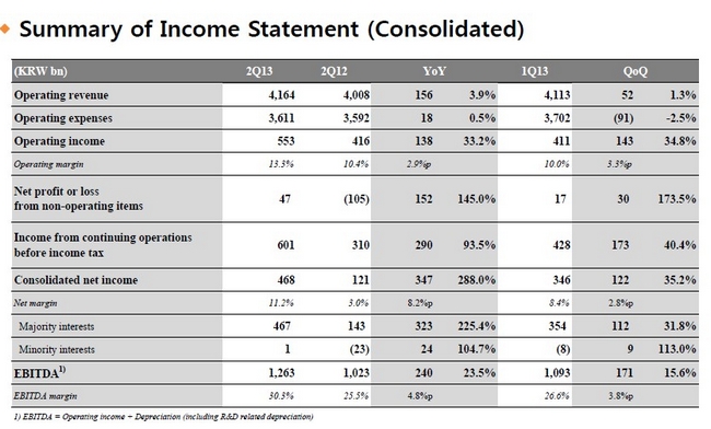 圖:SK電訊2Q13財務報告概況(基于K-IFRS)