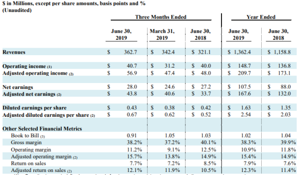 2019財(cái)年第四季度,II-VI銷售收入3.63億美元,相比上個(gè)財(cái)季為3.42億美元,去年同期3.21億美元;毛利率38.2%,上個(gè)財(cái)季和去年同期分別為37.2%和40.1%;凈收入2800萬(wàn)美元,上個(gè)財(cái)季和去年同期分別為2460萬(wàn)美元和2720萬(wàn)美元;每股攤薄盈利43美分,上個(gè)財(cái)季和去年同期分別為38美分和42美分;訂單出貨比(Book to Bill)為0.91,上個(gè)財(cái)季和去年同期分別為1.05和1.03。