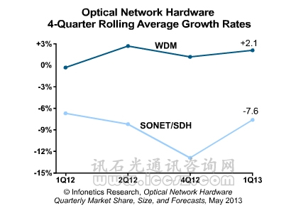 全球,整個(gè)光網(wǎng)絡(luò)硬件市場(chǎng),包括SONET/SDH和WDM設(shè)備,2013Q1總計(jì)為26億美元。