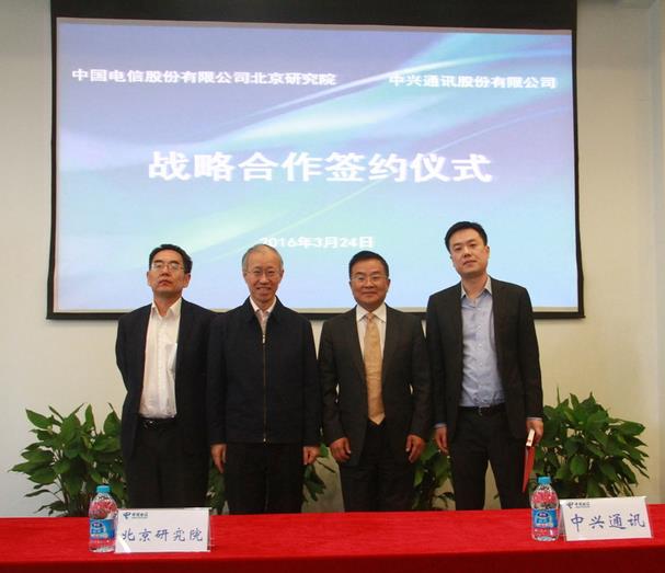 ICCSZ訊 3月24日,中國(guó)電信北京研究院與中興通訊就SDN/NFV、4G+/5G、物聯(lián)網(wǎng)等前沿技術(shù)的研究簽署戰(zhàn)略合作協(xié)議。中國(guó)電信北京研究院院長(zhǎng)李志剛、副院長(zhǎng)張成良與中興通訊副總裁劉鵬等相關(guān)領(lǐng)導(dǎo)和專(zhuān)家出席簽約儀式,雙方將通過(guò)資源及優(yōu)勢(shì)互補(bǔ)推進(jìn)前沿技術(shù)創(chuàng)新,更好地支撐中國(guó)電信下一代網(wǎng)絡(luò)構(gòu)建,為中國(guó)電信網(wǎng)絡(luò)重構(gòu)、業(yè)務(wù)重構(gòu)提供推動(dòng)力。