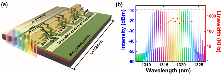 相比于克爾光頻梳超大帶寬的優(yōu)勢,通過半導(dǎo)體鎖模激光器產(chǎn)生的光頻梳具有轉(zhuǎn)換效率高、低功耗、小尺寸的特點,特別適合作為多波長激光器應(yīng)用于密集波分復(fù)用系統(tǒng)。然而,傳統(tǒng)的半導(dǎo)體鎖模激光器的梳齒間隔、傳輸帶寬和單根梳齒功率受限,離實際應(yīng)用仍有距離。