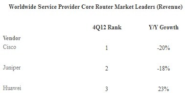 2012年第四季度,思科、Juniper和華為是服務(wù)供應(yīng)商核心路由器市場(chǎng)的領(lǐng)導(dǎo)者,這三家公司的市場(chǎng)份額總和超過(guò)95%。在該季度,思科仍以超過(guò)一半的市場(chǎng)份額領(lǐng)先,Juniper排名第二,而華為份額增長(zhǎng)至第三。