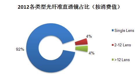 根據(jù)ElectroniCast的估算,2012年,在整體光纖準(zhǔn)直透鏡消費(fèi)值中,單個(gè)透鏡占比最高達(dá)到92%,2-12透鏡陣列占4%,超過12枚透鏡的陣列占4%。