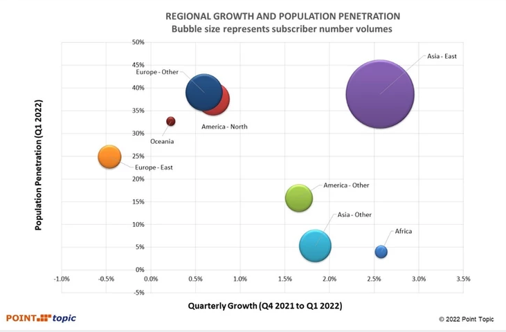 Figure 7. Penetration and quarterly growth by region (size of bubble represents subscriber volume). Source – Point Topic.