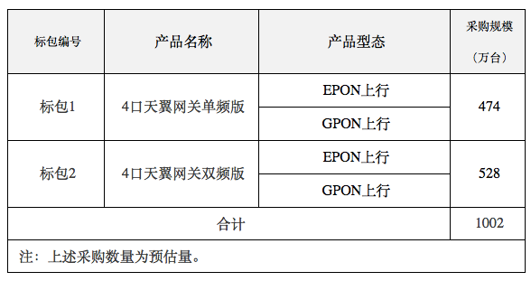 ICCSZ訊 中國電信日前發(fā)布公告正式啟動(dòng)2016年天翼網(wǎng)關(guān)集中采購。公告顯示,中國電信擬采購1002萬臺(tái)天翼網(wǎng)關(guān),其中4口天翼網(wǎng)關(guān)單頻版474萬臺(tái),4口天翼網(wǎng)關(guān)雙頻版528萬臺(tái)。