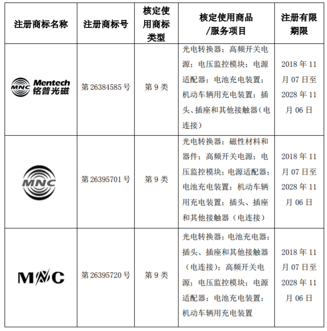 ICCSZ訊 (編輯:Nicole)東莞銘普光磁股份有限公司(以下簡稱“公司”)于近日收到國家知識產(chǎn)權局頒發(fā)的三項商標注冊證書,具體情況如下: