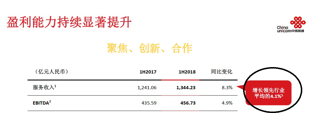 中國(guó)聯(lián)通遙相呼應(yīng),在推介材料第6頁(yè)就以添加紅色備注框的顯眼形式突出自己上半年1,344億元的服務(wù)收入同比增長(zhǎng)8.3%,顯著地“領(lǐng)先行業(yè)平均的4.1%”。
