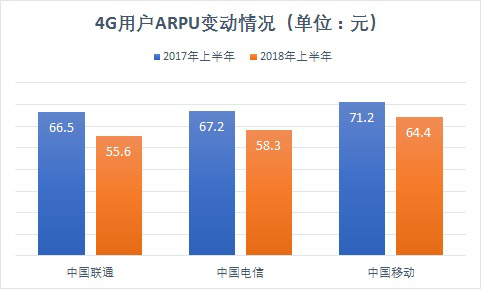 為了提升DOU增加手機(jī)上網(wǎng)流量來實(shí)現(xiàn)流量增收,三大運(yùn)營(yíng)商都付出了4G用戶ARPU下降的代價(jià),其中中國(guó)聯(lián)通4G用戶ARPU下滑了16%,高于中國(guó)電信的13%和中國(guó)移動(dòng)的10%。當(dāng)然,從政府要求三大運(yùn)營(yíng)商提速降費(fèi)的角度而言,中國(guó)移動(dòng)的4G用戶ARPU值高于59元的行業(yè)平均值,同比降幅也最低,貌似也有拖行業(yè)后腿之嫌。