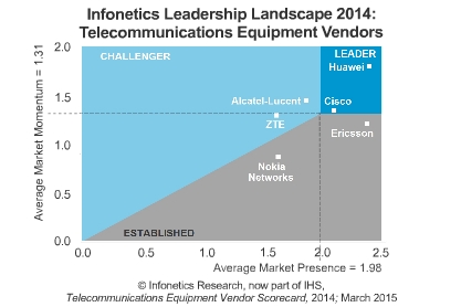 ICCSZ訊 近日,市場調(diào)研公司Infonetics發(fā)布其最新的關(guān)于2014年電信設(shè)備供應(yīng)商調(diào)查報(bào)告。該報(bào)告分析全球領(lǐng)先的六大電信設(shè)備供應(yīng)商——阿爾卡特朗訊、思科、愛立信、華為、諾基亞和中興——在基礎(chǔ)設(shè)施、軟件和硬件方面的發(fā)展情況。