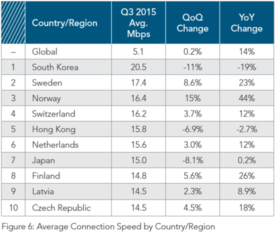 ICCSZ訊 全球領(lǐng)先的內(nèi)容分發(fā)服務(wù)商(CDN)Akamai昨日發(fā)布了《2015年第三季度互聯(lián)網(wǎng)狀況報(bào)告》。報(bào)告顯示,今年第三季度全球平均網(wǎng)速同比增長14%至5.1Mbps,但至少擁有25Mbps網(wǎng)速的用戶僅占全球人口的5.2%。