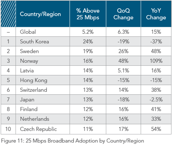需要指出的是,全球25Mbps及以上帶寬網(wǎng)絡(luò)的普及率僅為5.2%,同比漲幅為15%。在平均網(wǎng)速最高的10個(gè)國家和地區(qū)中,其網(wǎng)絡(luò)普及率均達(dá)到2位數(shù)。但只有在韓國,擁有25Mbps寬帶的人口比例達(dá)到了20%。