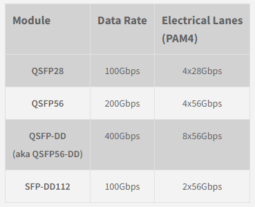 - 具有四個56Gbps信號通道的QSFP56模塊也適用于200GbE模塊,并且廣泛可用。業(yè)內(nèi)還定義了支持100GbE的2x56Gbps信號的SFP-DD112,但其受歡迎程度要低得多。