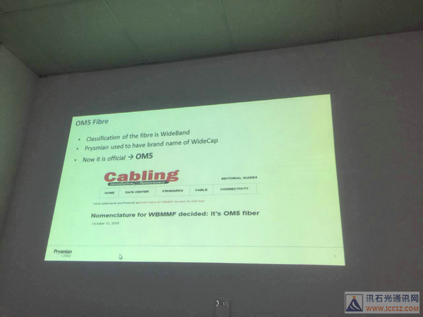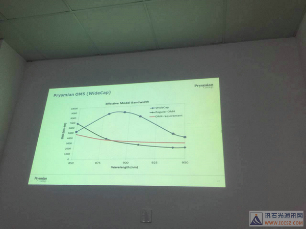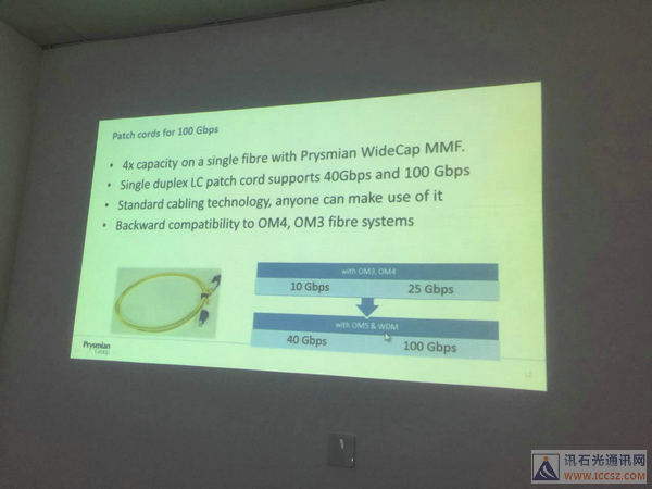 另一款新品是Om5多模光纖,其標準是利用波分復用技術可在一根光纖上實現4倍OM4的傳輸容量,它在空間節(jié)省和高速容量上有很大的優(yōu)勢。這款2016年推出的新產品OM5適用850~950nm,現在已經進入量產階段。OM5光纖的推出對于數據中心的建設將有巨大的促進作用,可以大大簡約空間。
