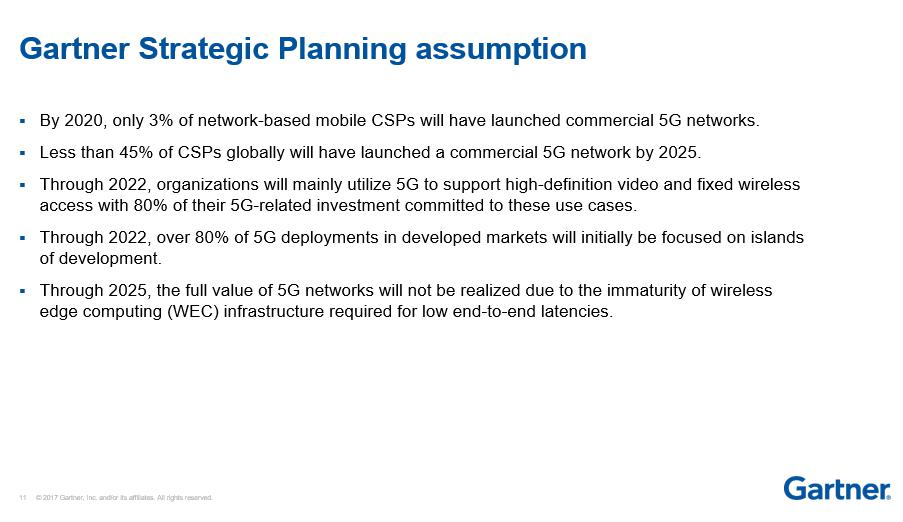 對于5G的發(fā)展,Gartner做出了五個預(yù)測。預(yù)計到2020年,全球只有3%的運營商會部署5G商用網(wǎng)絡(luò);到2025年,規(guī)模部署5G商用網(wǎng)絡(luò)的運營商也少于45%,5G的滲透率將會慢于LTE;到2020年,5G的應(yīng)用場景還將會停留在eMBB領(lǐng)域,主要應(yīng)用AR/VR這樣的大帶寬應(yīng)用以及固定無線接入,產(chǎn)業(yè)界需要發(fā)掘更多更有價值的應(yīng)用;到2020年,超過80%的5G將會在發(fā)達國家部署;到2025年,5G的整體價值才會實現(xiàn)。“5G會在2020年大規(guī)模部署,在推廣的過程中,產(chǎn)業(yè)界會出現(xiàn)很多成熟技術(shù),當端到端的時延降低之后,我們才會有大規(guī)模的應(yīng)用產(chǎn)生。”劉軼說。