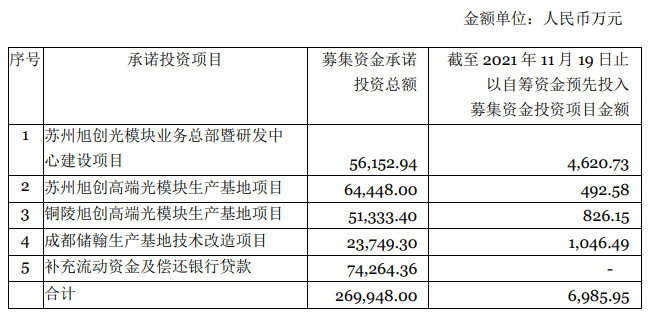 根據(jù)本公司于 2021 年 8 月 25 日公告的《中際旭創(chuàng)股份有限公司向特定對象發(fā)行 A 股股票募集說明書》,計劃對 5 個具體項目使用募集資金計人民幣 269,948.00 萬元。截至 2021 年 11 月 19 日止,本公司以自籌資金預(yù)先投入募集資金投資項目款項計人民幣 6,985.95 萬元。具體運用情況如下: