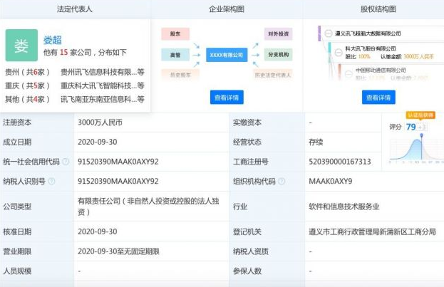 此外,股東方面,信息顯示,遵義訊飛超腦大數(shù)據(jù)有限公司由科大訊飛股份有限公司全資持股。