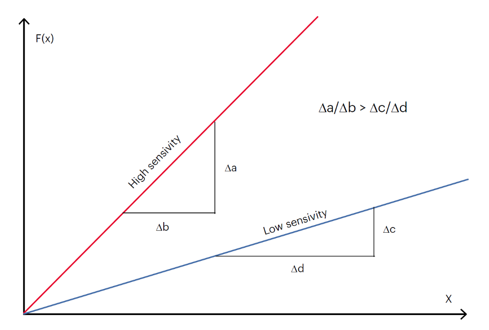 靈敏度是傳感器的重要特性之一,它決定了傳感器在捕捉或測量物理參數(shù)中的細(xì)微變化方面具有怎樣的性能。圖 2 所示為兩個(gè)具有不同靈敏度的傳感器。假設(shè)傳感器都有線性輸出,輸出的梯度代表了傳感器的靈敏度。例如,Δa 和 Δb 的比值就是紅線的梯度。產(chǎn)生紅線輸出的傳感器比產(chǎn)生藍(lán)線輸出的傳感器具有更高的靈敏度。典型的傳感器在其整個(gè)范圍內(nèi)可能不會(huì)產(chǎn)生線性響應(yīng)。因此,不同范圍內(nèi)的靈敏度可能會(huì)發(fā)生變化。