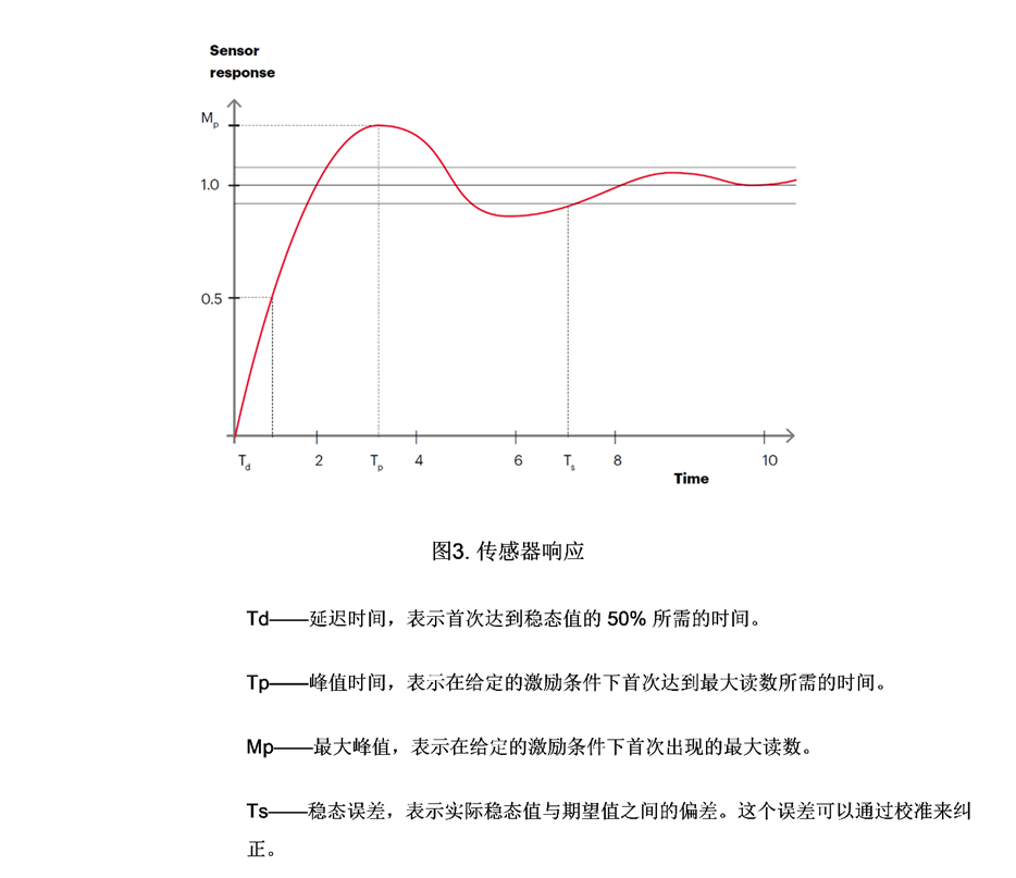 圖 3 所示為在階躍電平發(fā)生變化時(shí)受到輸入?yún)?shù)激勵(lì)的傳感器做出的輸出響應(yīng)。圖中的橫軸代表傳感器響應(yīng)的測量時(shí)間。當(dāng)傳感器輸出典型值與輸入?yún)?shù)的階躍電平變化對應(yīng)時(shí),輸出會(huì)切換到新的電平。但是,當(dāng)它達(dá)到新電平后,會(huì)出現(xiàn)過沖和下沖現(xiàn)象,需要經(jīng)過一段時(shí)間才能穩(wěn)定到新電平。