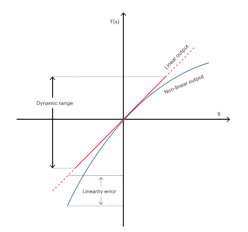 圖 4 所示為兩種傳感器的輸出圖。其中,藍(lán)線是傳感器的非線性輸出,在傳感器量程的兩端,測量精度明顯變差。紅線表示傳感器的理想線性輸出。如圖所示,線性誤差是藍(lán)線和紅線之間的 F(x) 差值。