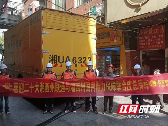 9月29日上午,模擬一次重要會議保障期間,市區(qū)一線路突發(fā)電力故障,導致主會場附近一匯聚機房斷電網(wǎng)絡被中斷的情形。湘西聯(lián)通面臨公司應急油機不足,且電力負荷較重,普通15千瓦油機無法帶動的情形,立即向國網(wǎng)電力湘西分公司請求緊急支援。收到支援的信息后,電力公司第一時間派出400千瓦車載油機進行支援。車載有機到達現(xiàn)場后,工作人員迅速進行電纜布放,通過車載油機發(fā)電恢復供電確保網(wǎng)絡正常運行。