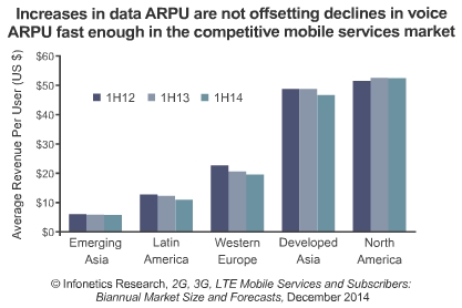 *全球移動(dòng)服務(wù)收入幾乎沒有發(fā)生變化,2014年上半年收入為3855億美元,同比2013年上半年僅增長(zhǎng)0.5%;加勒比和拉丁美洲(CALA),亞太地區(qū)和北美地區(qū)的收益增長(zhǎng)剛好抵消高達(dá)兩位數(shù)下降的EMEA地區(qū)。