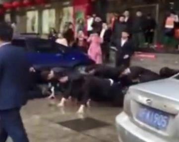 近日10余名身著西裝制服的男女員工并排站立,隨著前方一男子喊“開始履行自己的承諾”,大家紛紛雙膝跪地,雙手支撐,沿著人行街道向前爬行。爬行隊伍前面還有1名男子舉著一面紅旗引導開路。