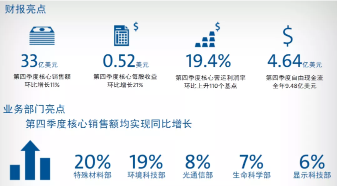 董事會主席兼首席執(zhí)行官 魏文德表示:“我們在第四季度取得了出色的業(yè)績,每個(gè)市場業(yè)務(wù)的銷售額和利潤都實(shí)現(xiàn)同比增長。2020年極具挑戰(zhàn),全世界都在應(yīng)對疫情、經(jīng)濟(jì)不確定性和社會動蕩所帶來的影響。這一整年中,我們專注于為客戶提供服務(wù),執(zhí)行戰(zhàn)略重點(diǎn),并保護(hù)我們的員工。公司銷售額保持強(qiáng)勁的增長勢頭,下半年利潤率擴(kuò)大,并創(chuàng)造了可觀的自由現(xiàn)金流。我們在人才和技術(shù)方面的投資,以及在關(guān)鍵市場的深入探索,正在為‘more Corning’創(chuàng)造更多機(jī)遇。我們持續(xù)鞏固公司的市場地位,履行對員工、社區(qū)、客戶和股東的承諾。康寧很自豪能夠不斷創(chuàng)造改善生活的創(chuàng)新技術(shù),保護(hù)人們的安全,幫助社會應(yīng)對疫情帶來的挑戰(zhàn)。”