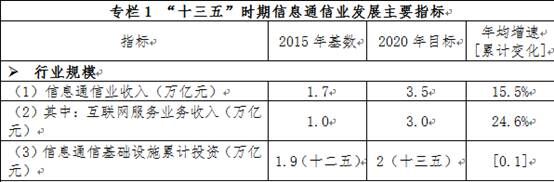 《信息通信行業(yè)發(fā)展規(guī)劃(2016-2020年)》提出,到2020年信息通信業(yè)收入將達(dá)到3.5萬(wàn)億元較2015年的1.7萬(wàn)億元增長(zhǎng)15.5%,其中互聯(lián)網(wǎng)服務(wù)業(yè)務(wù)收入將達(dá)3萬(wàn)億元較2015年的1萬(wàn)億元增長(zhǎng)24.6%。