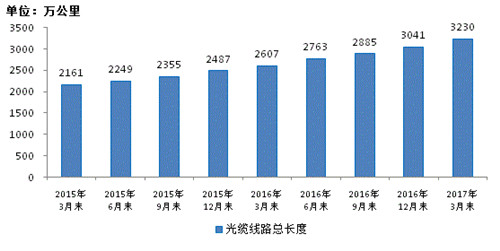 2015-2017年3月光纜線路總長度發(fā)展情況