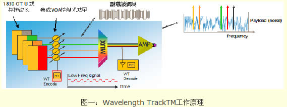Wavelength TrackTM技術(shù)是阿爾卡特朗訊的一項專利技術(shù),其實現(xiàn)原理是對每個進(jìn)入系統(tǒng)的波長(可以是第三方的異種波長)調(diào)制一個副載波,從而給每個波道編碼生成唯一的波道標(biāo)識WaveKeys以便管理光功率和識別光路由 (如圖一所示):