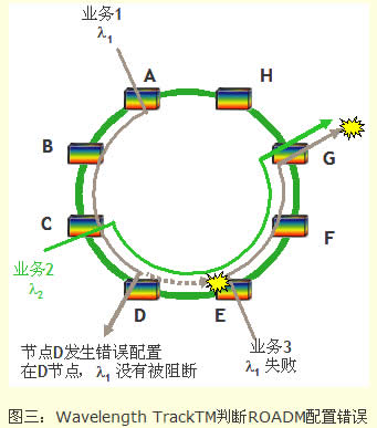 以F/ROADM錯配情況檢測來說,如果業(yè)務(wù)1 (1)和業(yè)務(wù)2 (2)運行正常,但部署業(yè)務(wù)3(1)失敗 ,所有波道的功率沒有問題,光放沒有告警,顯示正常。在傳統(tǒng)的運維方式下,維護(hù)人員無法定位故障發(fā)生在哪個節(jié)點或哪段光纖,需要派遣人員到個站點查看,往往需要需要數(shù)個小時隔離定位F/R/TOADM配置的問題。在有Wavelength TrackTM的情況下,操作人員可以在憑借Wavelength key在網(wǎng)管中心很快速地判斷出故障出在D點(因為業(yè)務(wù)1使用1從A-D是正常的),原因很可能是1未在D點阻斷,導(dǎo)致與業(yè)務(wù)3出現(xiàn)波長沖突。基于這樣的判斷,操作員可以遠(yuǎn)程控制在D點阻斷1,從而快速恢復(fù)業(yè)務(wù)。