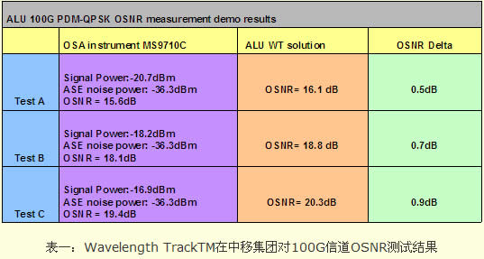 在2011年中國移動集團(tuán)組織的OTN測試中,阿爾卡特朗訊采用這種方式進(jìn)行了100G通道的測量,經(jīng)過與儀表比對,其誤差在1dB之內(nèi),完全達(dá)到實際應(yīng)用的要求。