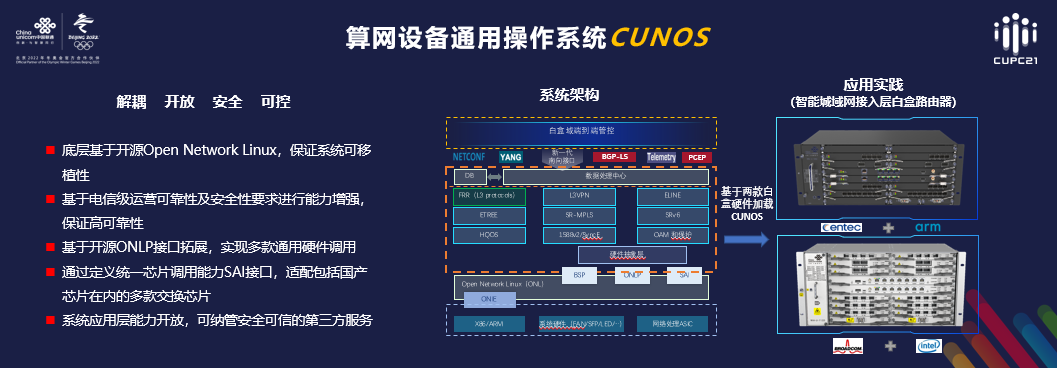 算網(wǎng)設(shè)備通用操作系統(tǒng)(CUNOS): CUNOS具有解耦、開(kāi)放、安全、可控等優(yōu)勢(shì)。系統(tǒng)底層采用開(kāi)源方案保證其可移植性,內(nèi)部采用高內(nèi)聚低耦合的模塊化設(shè)計(jì),創(chuàng)新性的通過(guò)ONLP接口拓展來(lái)調(diào)用通用框式硬件平臺(tái),通過(guò)拓展5G承載場(chǎng)景的交換芯片抽象層接口,實(shí)現(xiàn)了調(diào)用異廠(chǎng)商交換芯片的能力。系統(tǒng)應(yīng)用層能力開(kāi)放,可納管安全可信的第三方服務(wù)。CUNOS操作系統(tǒng)已經(jīng)完成與兩款框式通用硬件的集成,整體系統(tǒng)的功能和性能完全滿(mǎn)足5G承載網(wǎng)絡(luò)設(shè)備的技術(shù)要求。中國(guó)聯(lián)通研究院正聯(lián)合國(guó)產(chǎn)交換芯片廠(chǎng)商共同布局通用硬件底層生態(tài),推動(dòng)5G承載網(wǎng)絡(luò)芯片能力調(diào)用的標(biāo)準(zhǔn)化,確保路由器核心元器件的自主可控。CUNOS的發(fā)布標(biāo)志著中國(guó)聯(lián)通開(kāi)放網(wǎng)絡(luò)體系布局已經(jīng)邁向新階段。