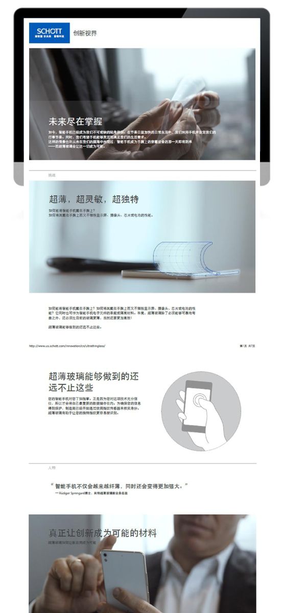 該平臺(tái)的項(xiàng)目經(jīng)理之一、肖特中國(guó)市場(chǎng)營(yíng)銷(xiāo)與戰(zhàn)略規(guī)劃總監(jiān)張琦女士表示:“玻璃創(chuàng)新視界的每個(gè)故事都是基于這樣一種理念,即玻璃可改進(jìn)產(chǎn)品或激發(fā)產(chǎn)品創(chuàng)意,并因此改善數(shù)百萬(wàn)人的生活。通過(guò)將傳統(tǒng)的技術(shù)講解與互動(dòng)性的講故事形式相結(jié)合,肖特創(chuàng)新視界旨在釋放未被發(fā)掘的創(chuàng)新潛力并激發(fā)每位訪客的好奇心。玻璃創(chuàng)新視界上展示的故事永遠(yuǎn)不會(huì)完整,因?yàn)檫@些玻璃材料都可能成為我們創(chuàng)造出前所未有的產(chǎn)品的創(chuàng)新之源。”