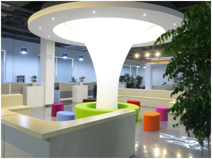 新辦公樓采用了現(xiàn)代以及人性化設(shè)計(jì),辦公室中間的員工休憩區(qū),采用納米布幕的透光灌頂形似了光纖,而圓形由下而上的造型,象征著員工緊密團(tuán)結(jié)以及翔光欣欣向榮的躍升趨勢。