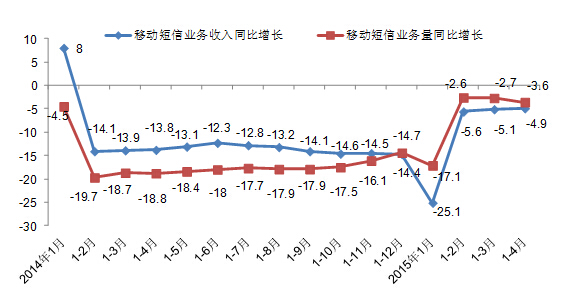圖一、2014-2015年4月移動短信業(yè)務(wù)量和移動短信收入同比增長情況(單位:%)