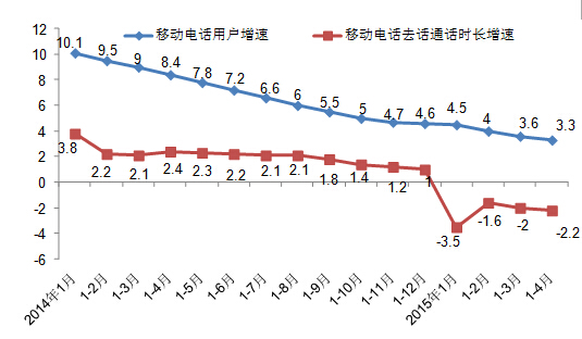從圖二可以看出,我國的語音通話也已進(jìn)入下降通道。2015年1-4月,全國移動電話通話量同比下滑1.5個百分點,其中移動電話去話通話時長完成9374.0億分鐘,同比下降2.2%,比1-3月降幅擴(kuò)大0.2個百分點。
