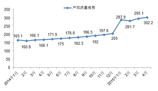從圖三,則可以看出,我國移動用戶戶均使用流量在經(jīng)歷快速上漲。2015年4月,月戶均移動互聯(lián)網(wǎng)接入流量達(dá)到302.2M,同比增長79.7%。