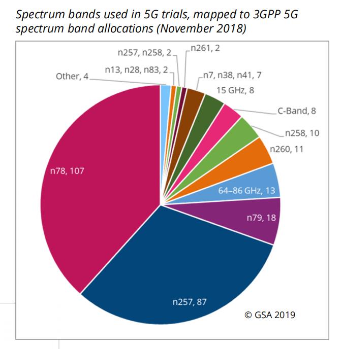 在GSA的統(tǒng)計中,目前在全球運(yùn)營商的5G試驗中,使用最多的頻段是n78頻段(3.3GHz-3.8GHz),共有107個試驗采用了這一頻段;其次為n257頻段(26.5GHz-29.5GHz),有87個試驗使用了這一頻段。