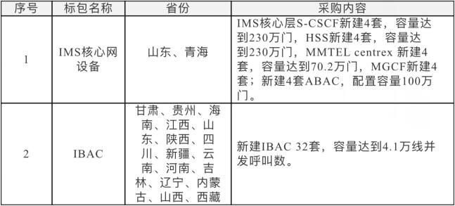 據(jù)了解,2016年IMS網(wǎng)絡(luò)建設(shè)核心網(wǎng)(擴容)工程(新建部分)招標包含兩個標包:標包一為山東、青海兩省新建IMS核心網(wǎng)設(shè)備,具體采購內(nèi)容包括:IMS核心層S-CSCF新建4套,容量達到230萬門,HSS新建4套,容量達到230萬門,MMTEL centrex新建4套,容量達到70.2萬門,MGCF新建4萬套;新建4套ABAC,配置容量100萬門。標包二為甘肅等十五省的新建IBAC設(shè)備32套,容量達到4.1萬線并發(fā)呼叫數(shù)。