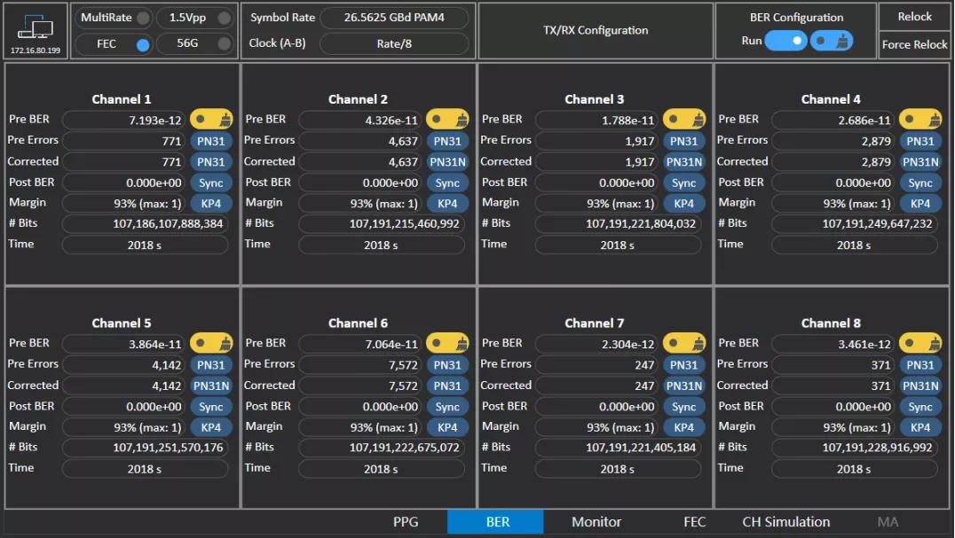 30分鐘直連誤碼率如下,八個(gè)通道的FEC margin都為93%(Codeword=1) :