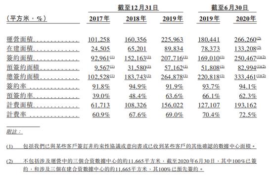 2018年上海、深圳、廣州、成都和河北的9個(gè)新數(shù)據(jù)中心投入運(yùn)營(yíng),并且公司在香港購(gòu)入首個(gè)物業(yè),重建為數(shù)據(jù)中心。2019年,又有10個(gè)新數(shù)據(jù)中心投入運(yùn)營(yíng)。截至2020年6月30日,客戶的總簽約面積超330,000平方米。