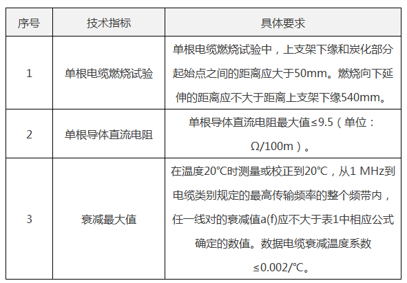 具有有效的泰爾產(chǎn)品認(rèn)證證書(shū)(TLC認(rèn)證)。且投標(biāo)產(chǎn)品的單根電纜燃燒試驗(yàn)、單根導(dǎo)體直流電阻、衰減最大值應(yīng)滿(mǎn)足以下關(guān)鍵技術(shù)指標(biāo)要求:
