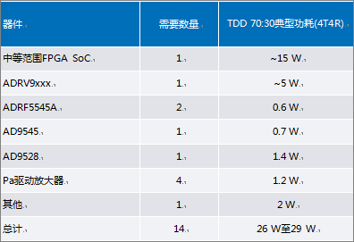實施O-RAN CUS和M面處理的典型中等范圍FPGA SoC,加上與IEEE 1588 v2 PTP堆棧同步,會消耗約15 W。典型的ADRV9029收發(fā)器會消耗5 W至8 W,由TDD或FDD配置,以及啟用的DFE功能的范圍決定。為此,必須增加時鐘功率、接收器功率、變送器功率,以及其他功率。表2顯示系統(tǒng)(不包括變送器鏈)的功耗總和示例,功率輸出等級不同時,該值存在很大差異。