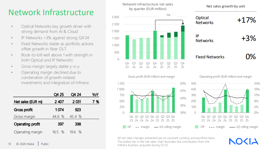 諾基亞2025年第四季度業(yè)績(jī)與預(yù)期一致,實(shí)現(xiàn)營(yíng)收61.25元,較去年同期59.83億歐元增長(zhǎng)2%,收購(gòu)Infinera帶來的增加部分被匯率波動(dòng)以及以下驅(qū)動(dòng)因素所抵消,在固定匯率和投資組合的基礎(chǔ)上,諾基亞的營(yíng)收增長(zhǎng)了3%,受到了網(wǎng)絡(luò)基礎(chǔ)設(shè)施業(yè)務(wù)增長(zhǎng)7%的推動(dòng)。網(wǎng)絡(luò)基礎(chǔ)設(shè)施的增長(zhǎng)主要由光網(wǎng)絡(luò)驅(qū)動(dòng),增長(zhǎng)了17%。移動(dòng)網(wǎng)絡(luò)業(yè)務(wù)增長(zhǎng)6%,無線接入網(wǎng)絡(luò)業(yè)務(wù)增長(zhǎng)強(qiáng)勁,業(yè)務(wù)持續(xù)穩(wěn)定。受核心網(wǎng)絡(luò)業(yè)務(wù)下滑的影響,云和網(wǎng)絡(luò)服務(wù)業(yè)務(wù)下降了4%。諾基亞技術(shù)營(yíng)收下降14%。2025年四季度毛利率為44.9%,同比下滑1.2個(gè)百分點(diǎn),凈利潤(rùn)5.44億歐元,較去年同期的8.13億歐元下降33%。