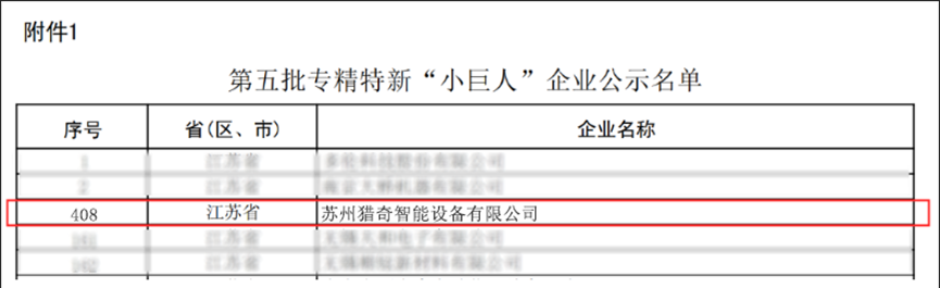 ICC訊 近日,國家工業(yè)和信息化部組織開展的第五批專精特新“小巨人”企業(yè)培育工作已完成相關審核及公示程序, 根據江蘇省工信廳發(fā)布的《關于江蘇省第五批專精特新“小巨人”企業(yè)和第二批專精特新“小巨人”復核通過企業(yè)名單的公示》,蘇州獵奇智能設備有限公司成功入選工信部第五批專精特新“小巨人”企業(yè)。