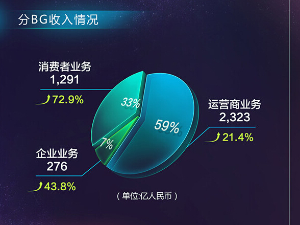 華為運營商、企業(yè)、終端三大業(yè)務(wù)收入分別占比59%、7%、33%。運營商業(yè)務(wù)收入達(dá)2323億元人民幣,同比增長21%,主要受益于全球4G網(wǎng)絡(luò)的廣泛部署;企業(yè)業(yè)務(wù)收入達(dá)276億元人民幣,同比增長44%;作為2015年度最顯著增長亮點,消費者業(yè)務(wù)收入達(dá)1291億元人民幣,同比增長73%,得益于消費者對高品質(zhì)手機體驗需求的增長以及品牌影響力提升,2014年,消費者業(yè)務(wù)的占比還僅為26%,在今年這個數(shù)字已經(jīng)提升到了33%,而這個占比還在不斷地加大。