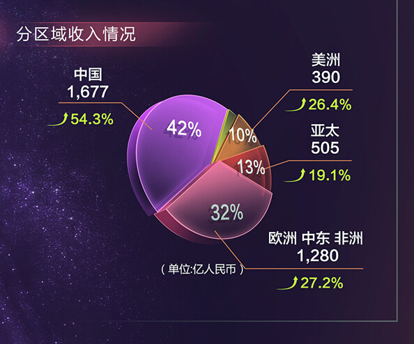 在區(qū)域收入占比方面,華為中國區(qū)營收1677億元,占比54.3%,在所有區(qū)域中占比最高;歐洲、中東、非洲營收1280元,占比27.2%;美洲390億元,占比26.4%,亞太505億元,占比19.1%。