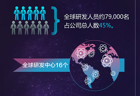 值得關(guān)注的是,華為2015年研發(fā)投入596億元,占銷售收入15%。過去十年,華為研發(fā)投入累計超過2400億元。目前全球研發(fā)人員約79萬名,占據(jù)公司總?cè)藬?shù)的45%,全球擁有16個研發(fā)中心,累計申請中國專利52,550件,申請外國專利30,613件,在全球企業(yè)專利申請量上位居第一。