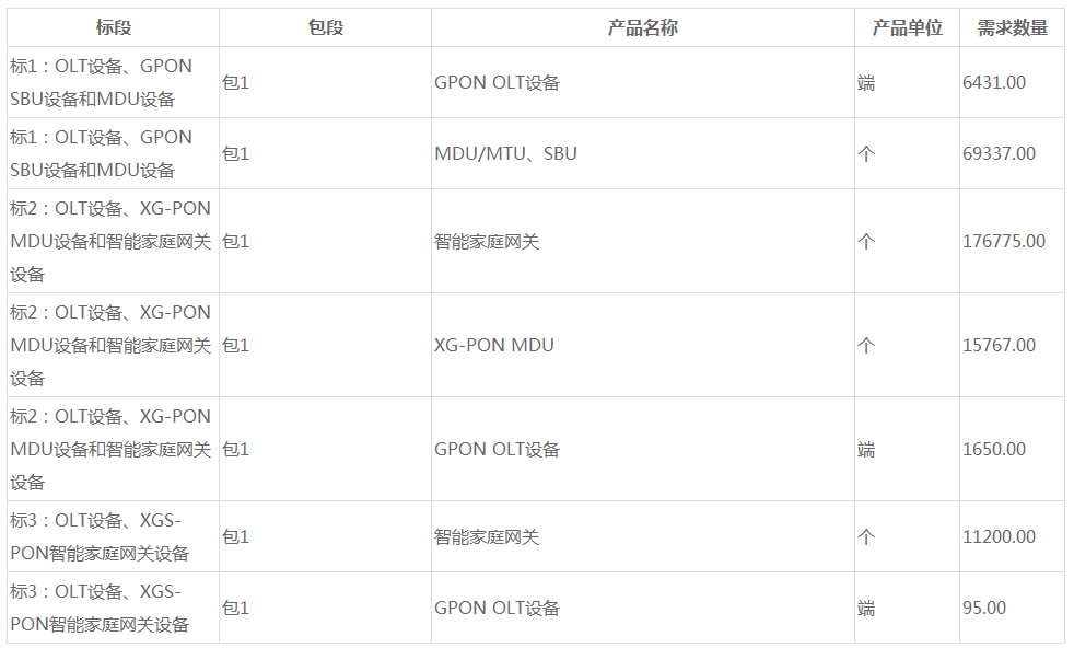標段二:OLT設(shè)備1650端,XG-PON MDU設(shè)備15767端,智能家庭網(wǎng)關(guān)設(shè)備17.68萬端;